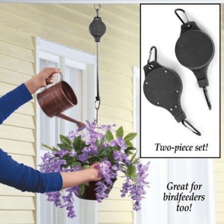 🌳🌱No more unsafe balancing on step ladders with heavy water cans! This handy pulley makes it easy to lower and raise your hanging baskets for watering, feeding, and plant care. A spring-loaded tape locks the basket in place at the desired height.